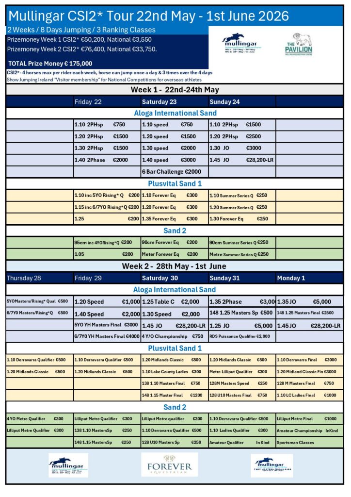 The Tour will feature eight days of top-class showjumping held over two weeks, with 22 international classes, including three ranking classes, alongside over 40 national classes. Additional highlights include the RDS Puissance Qualifier and the Pony Masters Finals.